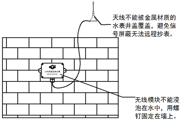2. 模塊不能浸泡在水中,安裝時用螺釘固定在牢固墻面,引出天線不能被金屬材質(zhì)的水表井覆蓋,避免信號屏蔽無法遠程抄表。